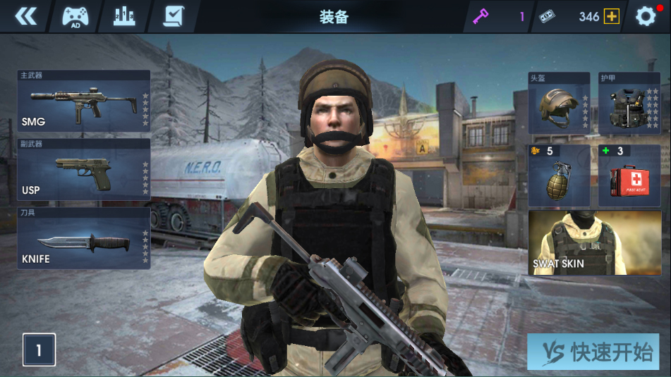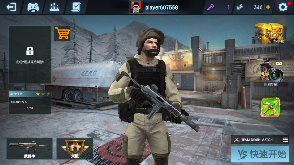 2、点击主页面左下角的武器库,选择自己需要的装备,检查完毕后快速开始
