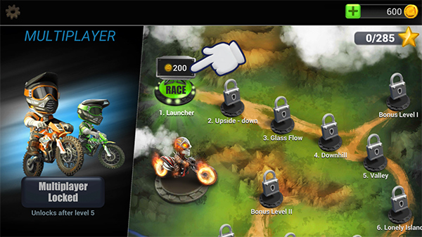 1、游戏操作很简单,经常玩这类作品的应该很快就能上手。右边两个两个虚拟按钮分别代表加速和刹车,左边两个方向键控制摩托车的前倾和后仰,注意本作中没有重力感应,需要全程手动调整车子平衡。游戏中需要用到的技巧也不多,按住 GO 拼命开,遇到斜坡及时下压前轮起跳获得加速,遇到泥泞路抬起前轮减小阻力等等,关卡中都会有提示。比较好玩的是每场比赛都有一群逗比对手,他们也会错误频出来影响你的注意力,基本上只要自身不失误,这些对手都不算个菜。玩家在孤独的领骑过程中,还可以趁机表演一下诸如后空翻这样的特技来获得额外的收入。2、游戏共设置 5 大赛道场景,每个赛道都有 9 个关卡,关卡都不长,前期路况也比较普通,到后面的路况也增加难度,玩起来更有趣味性。完成一个赛道的比赛之后,后面的赛道会自动解锁。9 个关卡完成后还可以开启附加的奖励关。