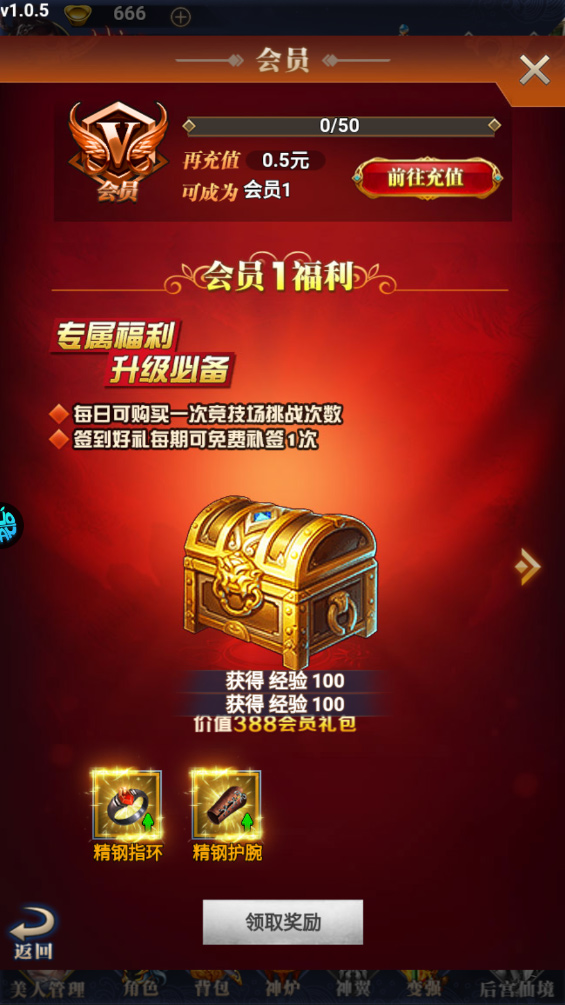 玩家点击会员豪礼,都可以免费领取第一个礼包,可以领取精钢指环和精钢护腕礼包。