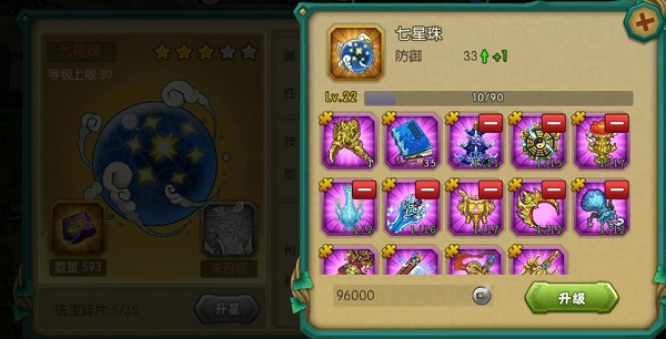 【关键点】:请不要消耗战斗法宝碎片,给二星法宝升级。很亏的,即使再不好用的战斗法宝也会给所有娃娃**公共属性,更会在山神宝库的关键时刻救你一命。