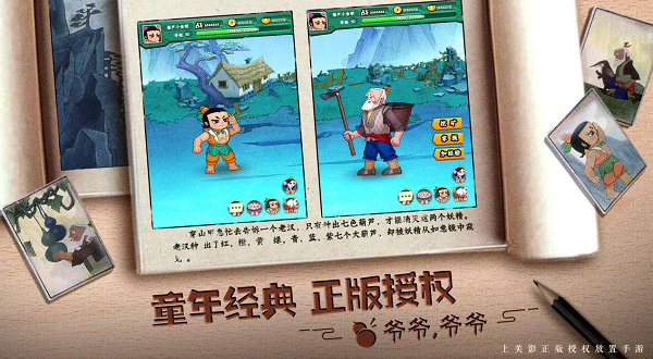 游戏世界观源自上海美术电影制片厂于1986年推出的《葫芦兄弟》动画,在这里,熟悉的爷爷、穿山甲以及葫芦兄弟们都将通过一幕幕经典剧情勾起你的美好回忆。在游戏中,我们能找回旧版纸质的漫画感觉,能重温童年守在电视机旁的回忆,一切的设定都让人仿佛置身原版动漫的世界,在降妖的同时重温当年的每一个细节。