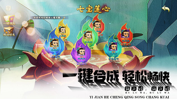 七宝莲心是你获得对应的葫芦娃碎片最直接、最容易的方式,当玩家到达对应等级后可以开启不同颜色的莲心,开启的莲心越多可以同时训练的角色越多,获取的收益越高。莲心开启后需要去挑战莲心内的幻象来获得使用权,挑战成功后可以永久使用莲心来修炼,使用莲心修炼后绝对的事半功倍