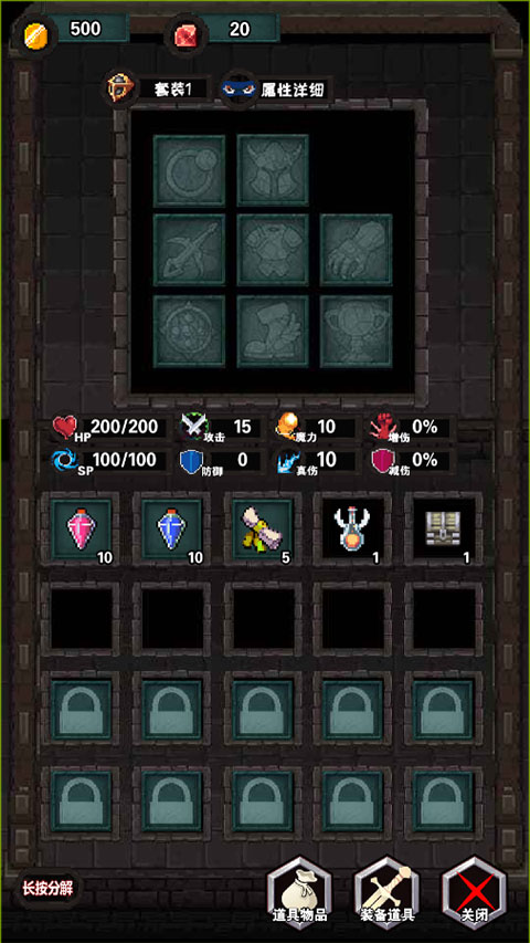 2、在装备道具中,可以查看我们拥有的道具武器的属性,也能够分解合成其他物品;