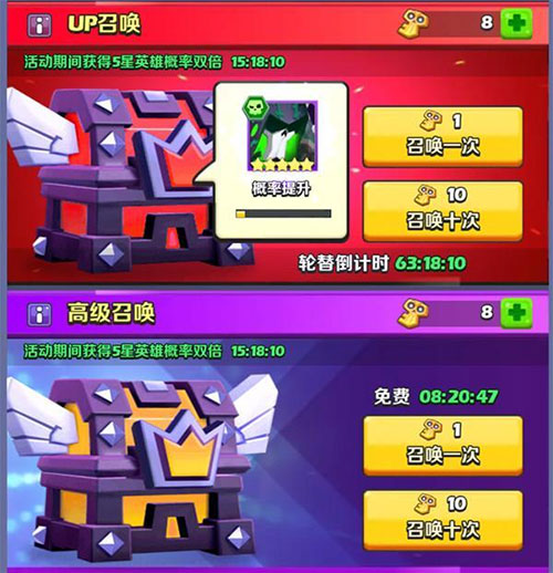 UP池和金钥池获得英雄星级的概率一样(大概率3星、小概率四星、极低概率五星),消耗金钥匙抽取英雄,两者的区别是每三天系统会随机UP一名英雄抽取几率,而且随着玩家的扭蛋数,还会逐步提升英雄的抽取几率。