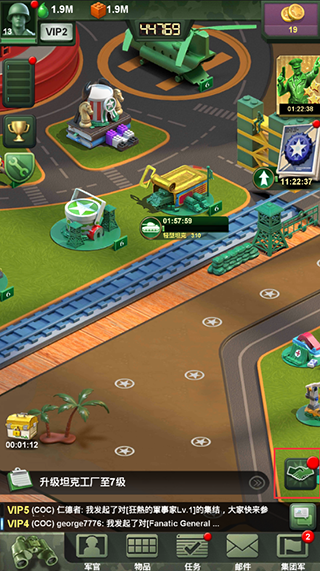 随着游戏进度提升,我们可以解锁地块布局我们的涂料、塑料、电能、金属、喷漆五类工厂用来生产资源,同时也会解锁军用帐篷、医疗所用来提升士兵训练效率和救治伤兵。我们在布局的时候尽量平衡每个设施的数量,并花点时间保持每个设施都能在最高等级,这样每天我们获取资源的效率将会大大提升!