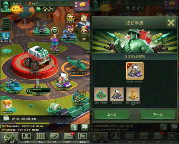 点击【成长手册】后,可以查看指挥部下个等级开启的建筑及功能;