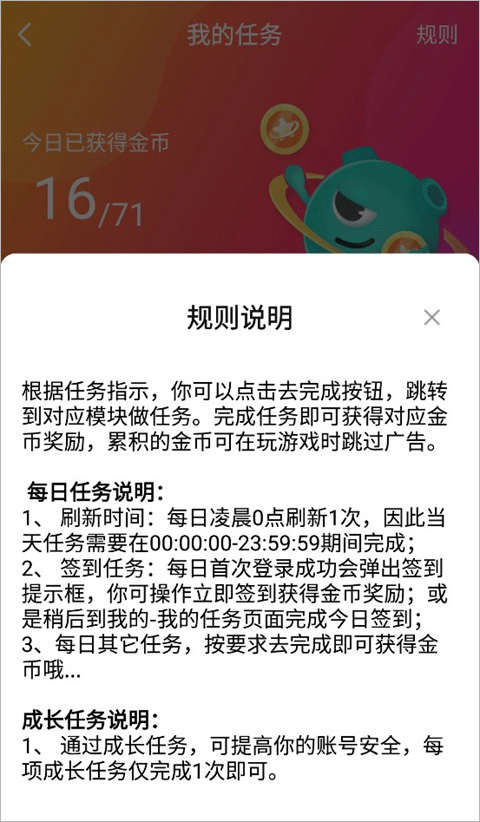 ②签到任务:每日首次登录成功会弹出签到提示框,你可操作立即签到获得金币奖励,或是稍后到我的-我的任务页面完成今日签到;