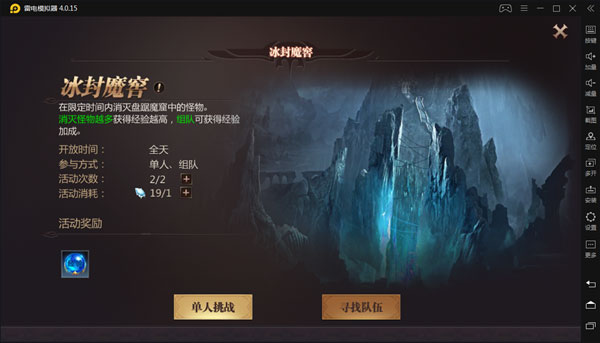 冰封魔窟也是玩家快速获取经验的重要途径,冰封魔窟副本每日可以挑战两次,不论单人还是组队都可以进入战斗。