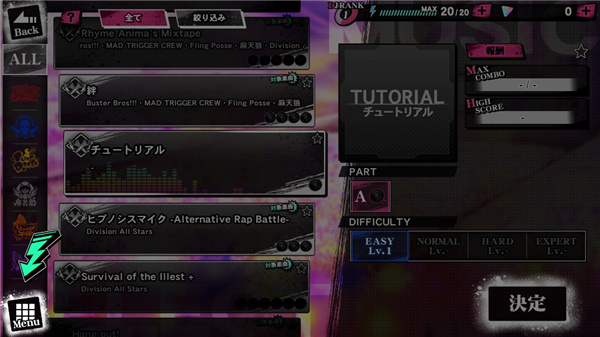 在催眠麦克风手游中,玩家只需要选择最经典的挑战节奏玩法Killer Scratch即可,进入催眠麦克风游戏界面映入眼帘的是一个DJ圆转台,玩家只需要配合着节奏点击圆台进行演奏即可,了解熟悉不同颜色的节奏需要如何操作以后,就可以自主的去选择曲目和曲目的难易程度了。