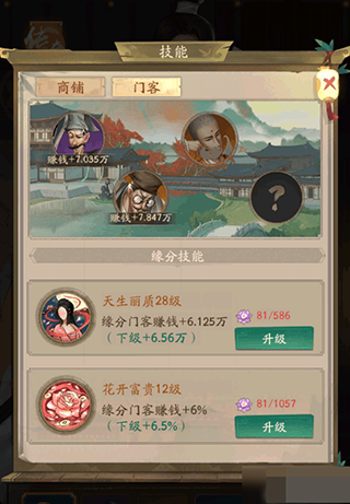 提升知己的魅力值可以强化其经商技能,可以帮助提高玩家自身的赚速,知己的经商技能等级会直接影响到店铺的赚钱速度。每个知己还会对应几个缘分门客,强化自身的专属技能后可以提高缘分门客的属性加成。
