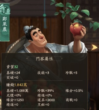 每个门客都有不同的职业,在不同的店铺派遣不同职业的门客提升的赚速不同,门客的等级越高,资质越好给店铺带来的收益越多。稀有门客的初始资质比普通门客要高出许多,所以建议优先培养稀有门客。门客的基本属性包括资质、基础、技能、珍兽、缘分、光环、精进等。门客属性影响门客赚钱速度。