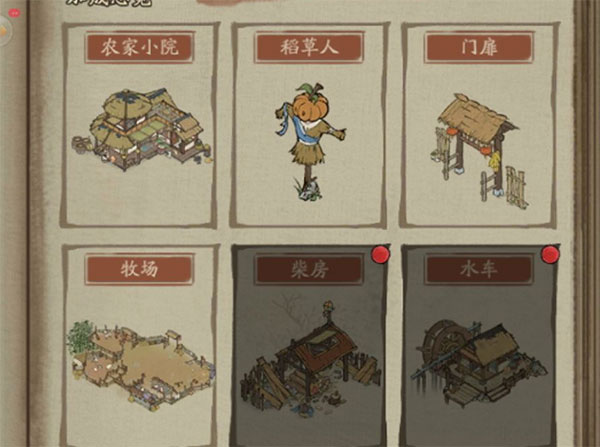 然后还有建筑的选项,玩家可以根据自己的能力等级去修建农家小院,凉亭,水池,雕像等建筑的。