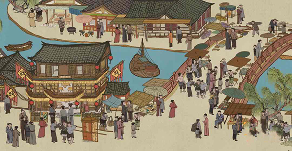 【汴梁美景,待你欣赏】背景和建筑采用水墨风格描绘,画面中汴梁百姓忙碌地操持着手中的工作,将古代市井气息原汁原味地呈现给各位玩家,再现了“清明上河图”的韵味。