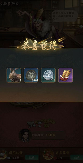 每个关卡分成5个小关,前面4关都是获取阅历的,操作方法非常简单,只要点击贸易按钮,角色就会骑马飞奔,朝着路中央的阅历宝箱奔去,就会自动收集阅历。这时候关卡上面就会显示完成进度条,当来到第一个铜钱处就说明第一关顺利完成。