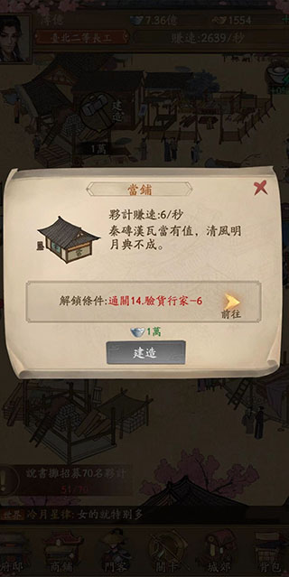 游戏中还有独特的贸易玩法,玩家需要完成各种关卡任务来解锁更多商铺,并通过合理的资源分配和随机事件处理来提升收益。此外,招募合适的门客也是店铺成功的关键,不同类型的门客能为商业、农业或制造业带来不同的增益效果。游戏的操作简单易上手,适合喜欢轻松休闲玩法的玩家。