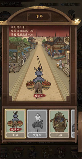 在贸易过程中,主角所乘坐的交通工具也是可以切换的,但不同交通工具要等到特定的章节才能解锁,而交通工具可以有加成效果,例如减少贸易银两消耗或者贸易阅历产出提升等。
