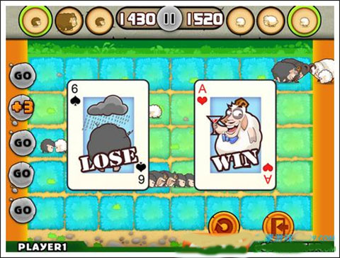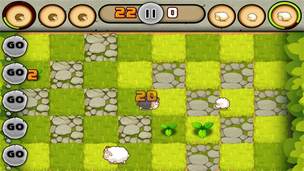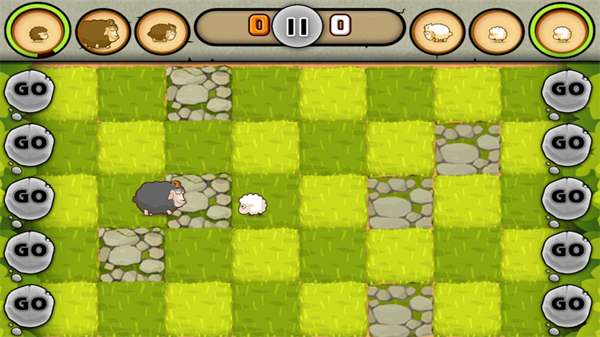 这个模式的玩法很容易也富有技巧性,开始准备前双方整容将分别位于左右两侧,决斗场中央共五条进攻线路,点击任意一条线路上的“GO”则向该路派遣一只屏幕上方的准备出战的羊。当然敌人也可以在相应线路派出羊只堵截,这个时候技巧和策略性就来了。当我们出击中的碰碰羊冲到对方的底线则赢得分数,在限定时间内获得分数高的一方获胜,因此在策略模式中技巧策略的选择和运气同样重要。