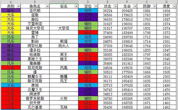 众所周知,速度的快慢最直接的体现就是出手先后,速度快的优先出手,当大家的主力如风王瓦妹暗主都十星的时候,谁的速度快,谁往往就能占据很大优势。下面贴出这个游戏大部分英雄的基础十星速度(图片取自官方群某大佬整理)