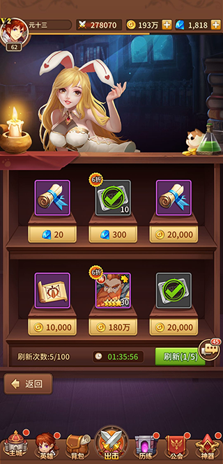 2、出击、远航活动,有史诗级的任务是一个高级召唤券,这个任务颜色可以,但是不划算。只相当于你花了一次任务信息只得了25钻,而同样的史诗级任务可以得一个300钻的四星级英雄。