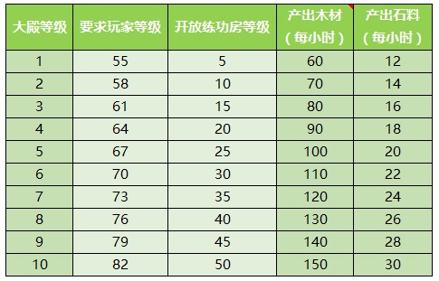 【大神有话说:个人建议优先升级大殿,一是战力提升较高,二是材料产出增加,整体会提高建筑升级速度。】