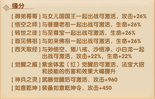 西天取经:与孙悟空、猪八戒、沙悟净、小白龙一起出战可激活,攻击+22%,生命+22%