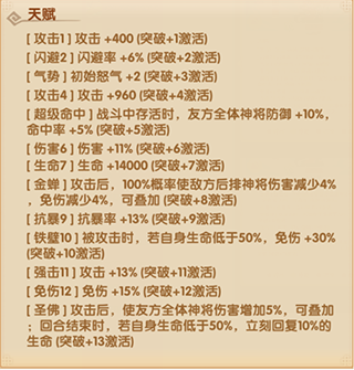 5、超级命中:战斗中存活时,友方全体神将防御+10%,命中率+5%(突破+5激活)