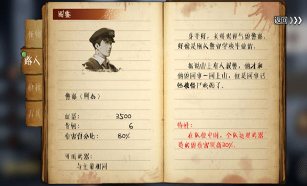 一个漂亮的小姐姐,伤害百分比75,比胖子高但只能用拳头和匕首,输入嘛你们懂的。四格背包,带不了太多东西。天赋是全队减伤百分之50,这个天赋敲伤害的!然并卵的是她跟阿难两个是剧情杀,必死的人(为什么要小姐姐死,我想救她的说)。一个打酱油的npc,不用保了(忍痛说的,有想任性的小伙伴嘛)。