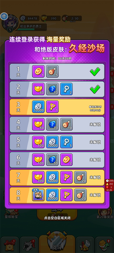 连续登录可获得海量奖励和绝版皮肤【久经沙场】,可获得奖励有:还魂币、体力、元宝、随机强化石、普通钥匙、高级钥匙。只要登录就可以领取,还要什么自行车!