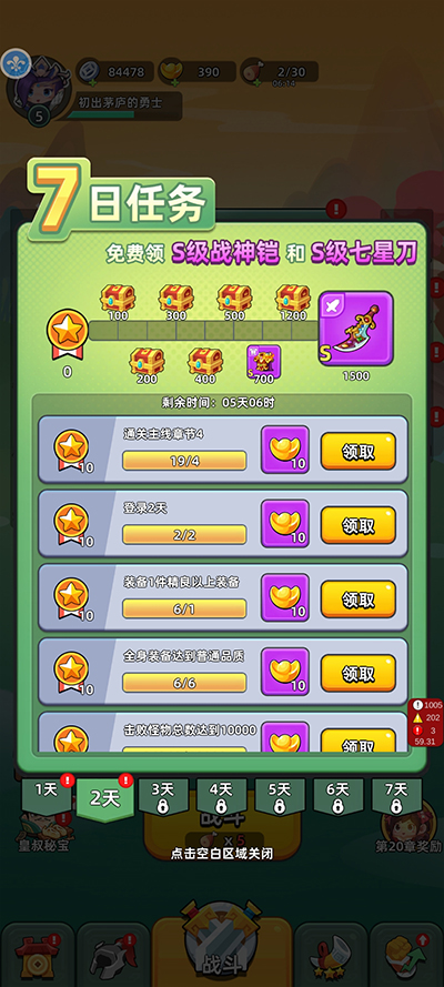 完成7日任务可获得S级【战神铠】和S级【七星刀】,可获得奖励有:元宝、随机强化石、普通钥匙、高级钥匙。7日任务与登录、通关章节、装备养成等有关。怎么我还在畅爽割草,任务就完成了啊?