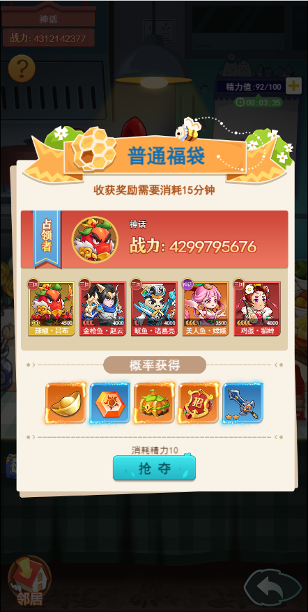 注:可以选择抢夺其他玩家即将开启的福袋,抢夺后的开启时间不会重置(降低了被抢夺的成本)