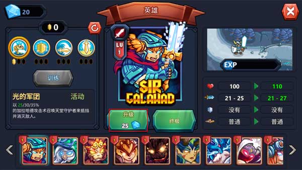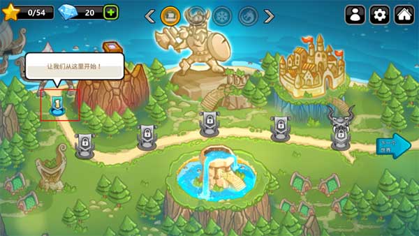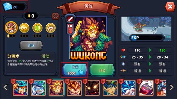 使用游戏开发商免费赠送的英雄,通过英雄来通过各个关卡获得金币和水晶,从而解锁其他英雄。
