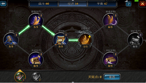 经济天赋的加点,如果是和平时期或者不喜欢打仗的玩家,建议主加经济一栏,经济天赋可以提升采集速度和采集的产量,加快自身采集的速度,一般自己有小号的可以这样加点,经济天赋就可以全部往下加着走,提升各种资源的采集速度和产量。