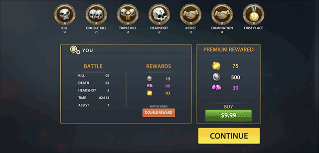 7、最后获得胜利后会出现战斗数据展示界面,玩家可以在这里查看自己的战绩,看完后找到并点击“continue”选项;