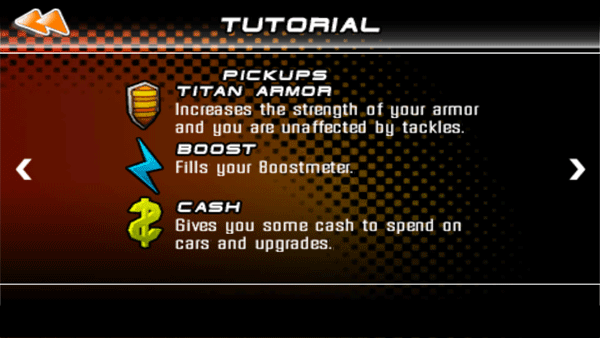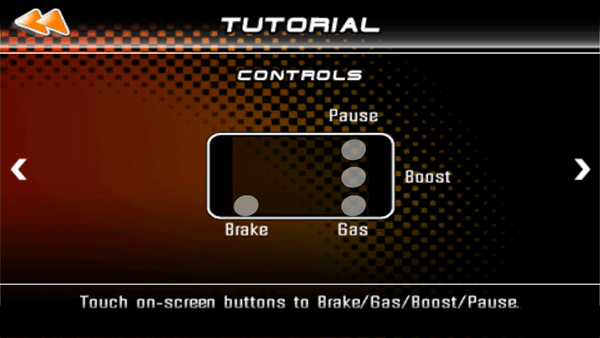 游戏采用的是重力感应配合按键操作来进行操作的。转弯的时候需要通过倾斜手中的设备进行转弯。如向右转弯就将设备向右倾斜就可以了。游戏中的操控很是非常的容易,左下角的"BRAKE"按键为刹车键,可以减速。而右边中间"boost"为加速键,点击加速键可以提升速度,但是前提是需要氮气,氮气可在游戏中收集。