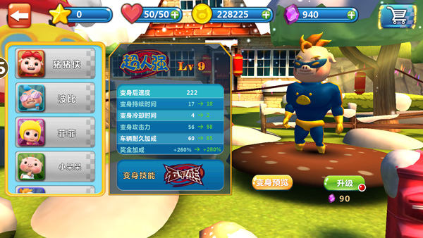首创变身系统,深度结合猪猪侠动漫五灵变身情节,变身后无可匹敌的加速,并撞晕路上碰到的其他角色造成一定伤害,打造畅爽体验新高度。