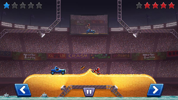 如此一款集竞技和娱乐性于一体的休闲作品怎能少得了PVP玩法,《撞头赛车》支持两个玩家在同一设备上进行对战,届时屏幕将会出现四个按钮用于控制两辆赛车,玩家同屏对战的出现,让游戏的互动性跟高,除了游戏与玩家的互动之外,更促进了玩家和朋友之间的友谊互动。不过到时候得用iPad才可能有较好的体验吧。