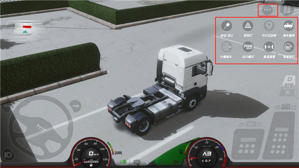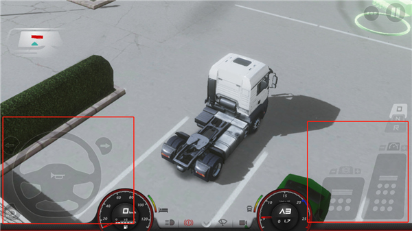 2、点击右上角菜单,点击左侧钥匙图标启动卡车,即可开始按踏板操作,坐标为方向盘,右侧为刹车和油门,油门上方为前进和倒挡。