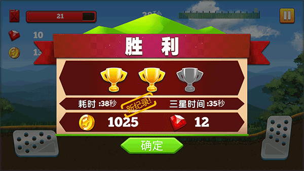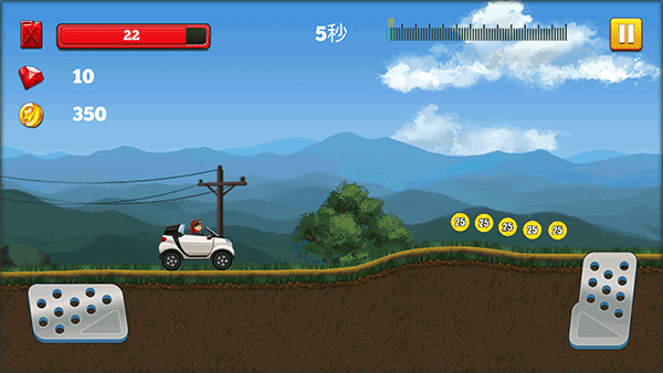 5、两个操作按钮,油门和刹车,游戏采用虚拟按键控制,左边的按键是刹车,右边的按键是油门。按油门前进,到达指定的地方则通关。上方红色的是汽油量,你需要注意控制油量。