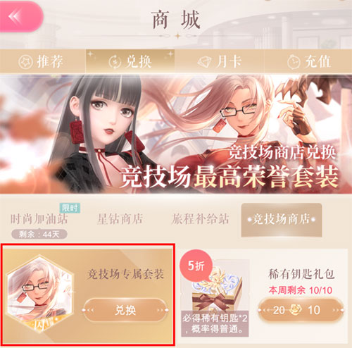 选择【竞技场专属套装】,点击【兑换】,即可进入竞技场专属套装兑换界面。