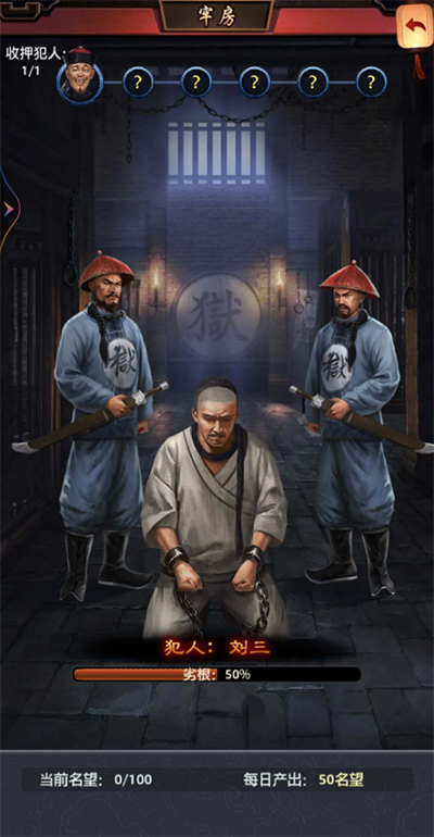 抓获的犯人可以在牢房中进行惩罚,每次耗费10名望,可以获得粮食、金钱、各种丹药、加好感和颜值的道具、元宝、强化卷轴等等。每个犯人被惩罚后扣除的血量不一样,每打光一个犯人的血量才能继续惩罚下一个。而且每个犯人掉落的物品也不一样,越排在后面的犯人掉落的东西越好。名望会在每天凌晨根据你自己的每日产出量(也跟通关数有关)增加,当天剩下也会保留,除非达到上限。