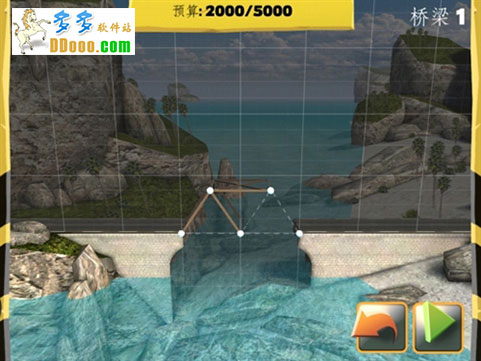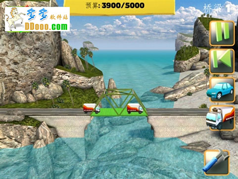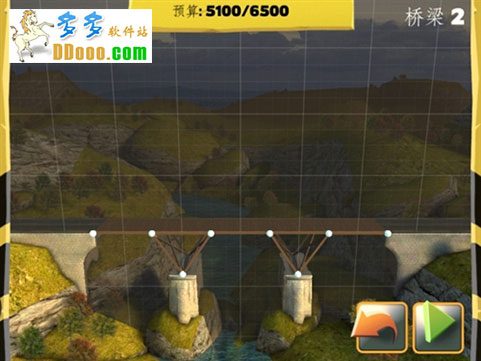 每一关开始时都会有如下图所示界面出现,右上方会有要建的桥的地理位置显示,下面会有桥身要横跨的距离标识;同时,本关卡可以用到的建筑材料也会显示出来。修建时要注意的是,所用材料是要消耗预算的,每一关在屏幕上方都会有预算数字,超出预算就不能修建了。