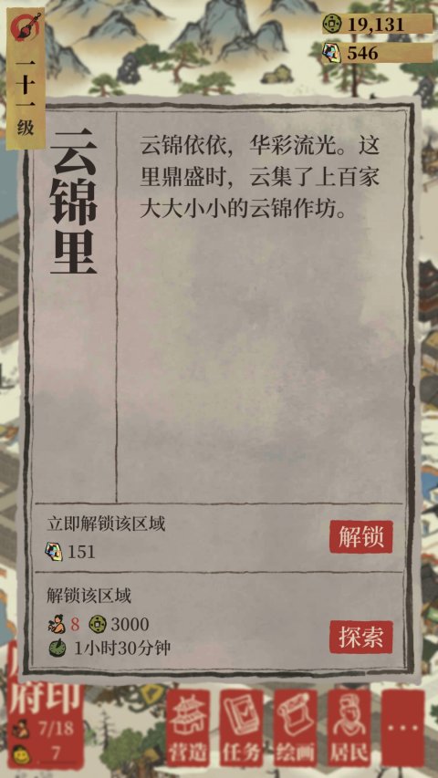 当土地不够用的时候,可以消耗人力、铜钱和时间,探索并解锁新的区域,将原本的残垣断壁、枯木清除干净,便又能获得一片宽阔的天地。