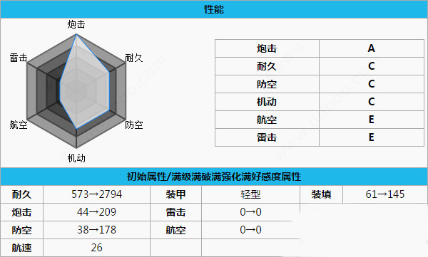 虽然有着A级别的炮击,但是由于自身的技能触发几率较小并且CD太长。自身的耐力成长也不高。