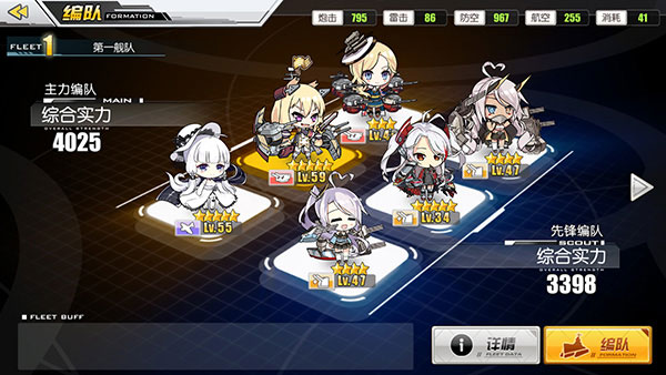 在编队中,每次出击最多选择六艘战舰,而驱逐舰、轻巡洋舰、重巡洋舰只能作为前锋部队,而战列舰、战列巡洋舰、航母和维修舰只能作为后排部队。