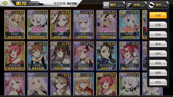 游戏中的船分类驱逐舰、巡洋舰(轻巡洋舰、重巡洋舰、战列巡洋舰)、战列舰、航母(轻航、正航)、维修舰、重炮等类型。