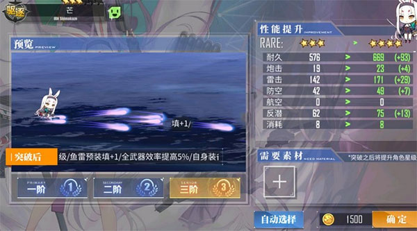 我们先来看看岛风的属性,120级好感度爱满级满破满强化属性为耐久2362、装填224、炮击76、雷击602、机动232、防空161、反潜210、幸运41、航速48。驱逐主炮效率85%、鱼雷效率170%、防空炮效率90%。尤其值得一提的是岛风鱼雷有双预装填效果,也就是开局就可以两连发。
