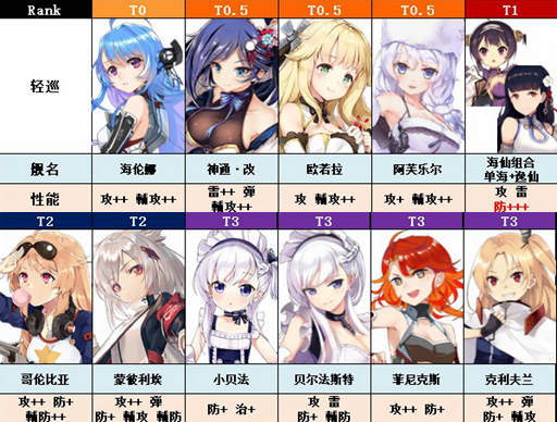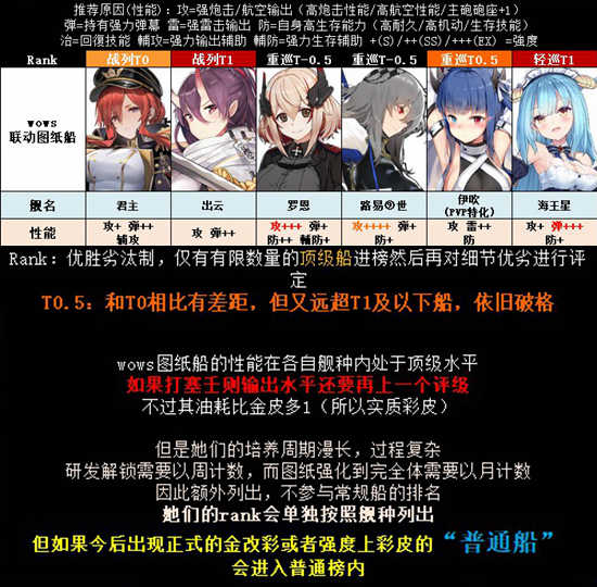 本榜为限制数量的优胜劣汰制度,即限定T0只有一艘,T1两艘等,除非存在完全绑定组合,或者同质姐妹船,又或者能力太过出色和其他船对比度显著的。换句话说,本榜的意义在于,在没有真爱的前提下,你可以把资源只提供给T0级船,并且每个舰种只用练极少数量就足以应对各种局面。