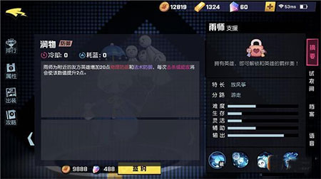 被动技能“润物”:该被动技能是可以为附近的友军增加双防御的,在为友军提供的同时,自己也会相应的有一个双倍数值的防御。
