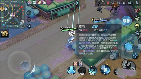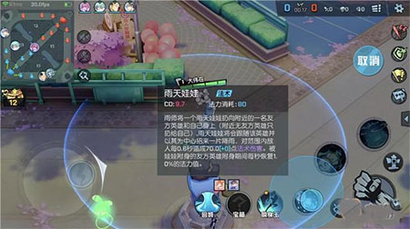 第一技能“雨天娃娃”:释放该技能会向附近的友军和雨师自己身上扔出一个雨天娃娃,雨天娃娃会在命中的友军和雨师自己的头顶上方招来一片降雨,对范围内的敌方造成伤害。