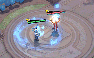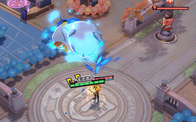 技能1【炎之拳】红孩儿退后蓄力,蓝色的火焰凝聚,随后他冲向敌人,残影犹如巨大的手臂,冲击力则形成硕大的拳头,狠狠地击打在敌人身上。
